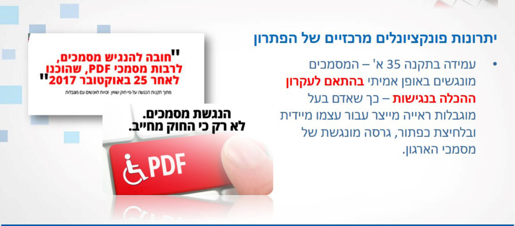 תוכנה להנגשת מסמכים וקבצי PDF, בקליק! בשנת 2013 נכנסה לתוקף תקנה 35 של חוק ההנגשה לשוויון אנשים עם מוגבלויות, המחייבת ארגונים ובתי עסק לספק התאמות נגישות בשירות האינטרנט ולהנגיש כל מסמך שהוכן מתאריך 26 באוקטובר 2017 ואילך. PB Digital מאפשרת לארגונים להנגיש ביעילות כמויות עצומות של מסמכים דיגיטלים – הן בפורמאט PDF והן בפורמאט HTML … המשך לקרוא הנגשת מסמכי PDF, מסמכים וטפסים דיגיטאלים בהתאם לחוק הנגשת מסמכים ועקרון ההכלה בנגישות – כך עושים זאת ביעילות